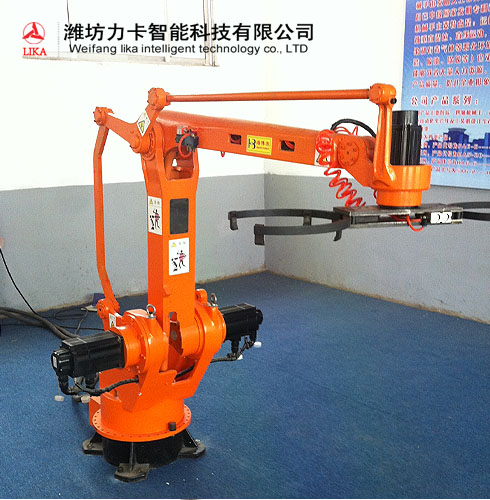 码垛机械手臂是将已装入容器的纸箱,按一定排列码放在托盘、栈板(木质、塑胶)上,进行自动堆码,可堆码多层,然后推出,便于叉车运至仓库储存。本设备采用PLC+触摸屏控制,实现智能化操作管理,简便、易掌握。可大大地减少劳动力和降低劳动强度。码垛机是输送机输送来的料袋、纸箱或是其它包装材料按照客户工艺要求的工作方式自动堆叠成垛,并将成垛的物料进行输送的设备。